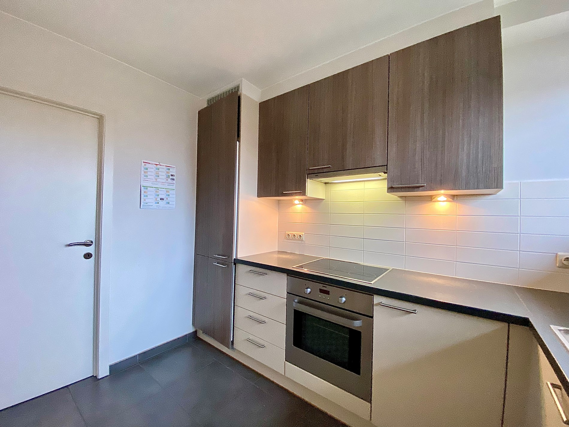 Het appartement heeft een ruime inkomhal met gastentoilet, grote woonkamer met aangrenzend terras en volledig ingerichte keuken met alle toestellen incl.vaatwasser. Naast de keuken is ook een berging waar wasmachine en droogkast kunnen staan.
