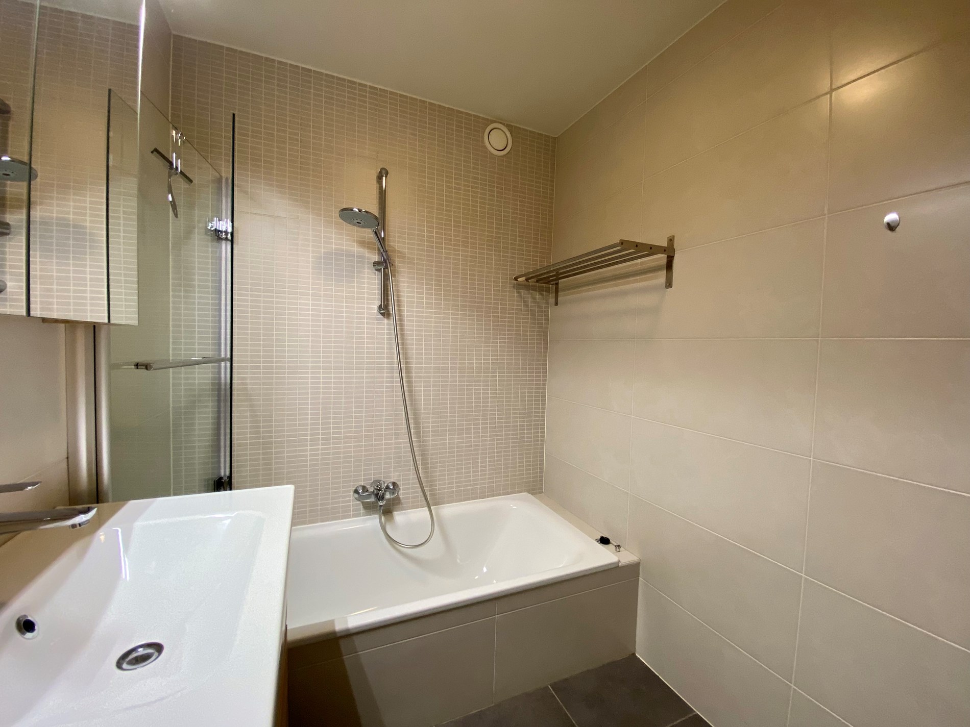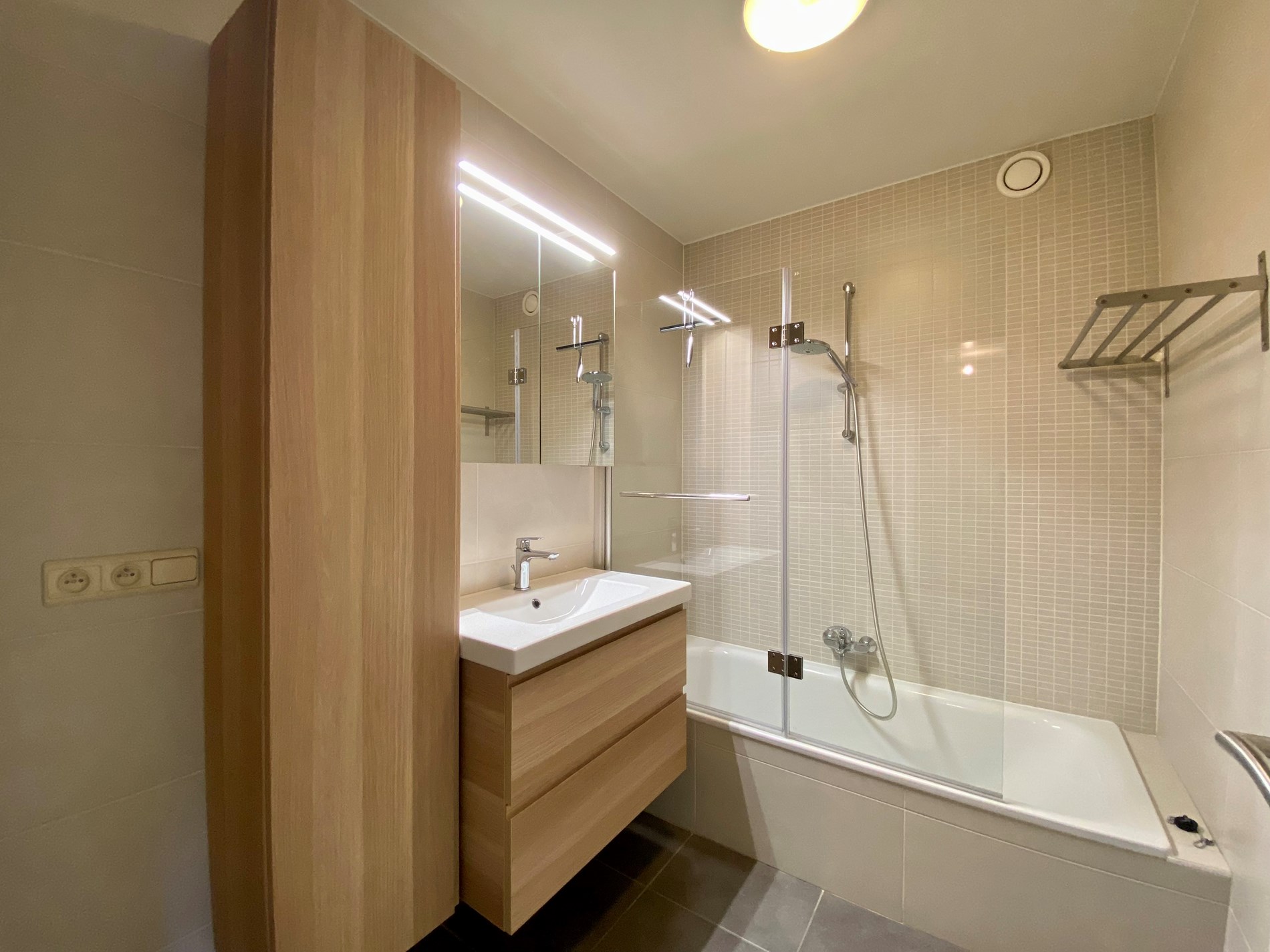 Verder beschikt de woning over twee slaapkamers en een ingerichte badkamer met lavabomeubel, spiegelopzet en ligbad (mogelijkheid om te douchen in het bad met glazen scherm).