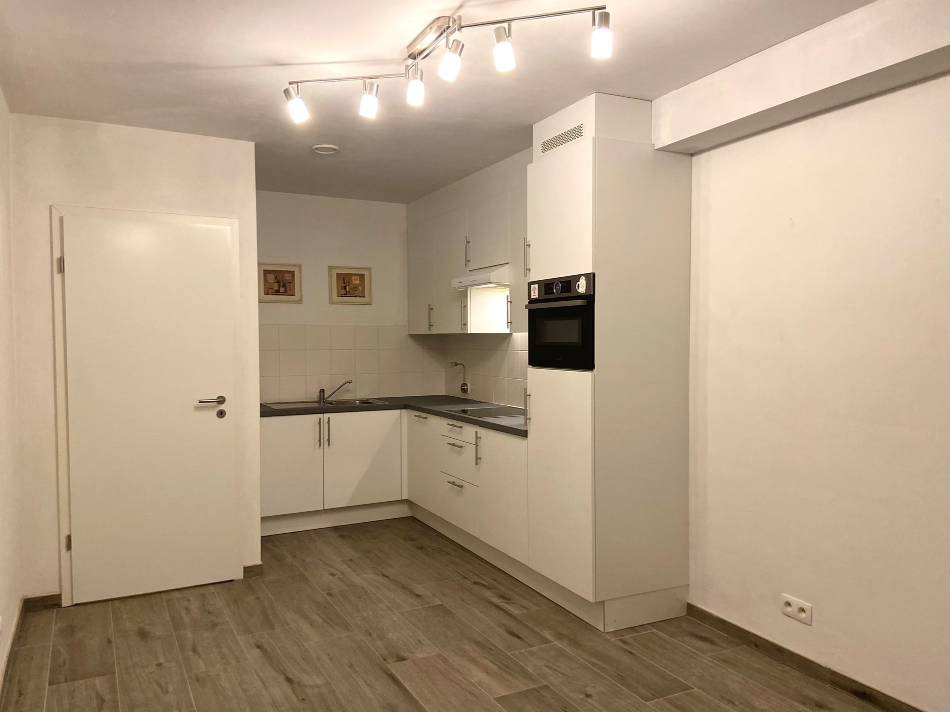 Bij binnenkomst komt u in de gang die toegang geeft tot de lichtrijke woonkamer, perfect om te ontspannen. De open, ingebouwde keuken is volledig uitgerust met een kookvuur, dampkap, ijskast, combi-oven en vaatwasser.