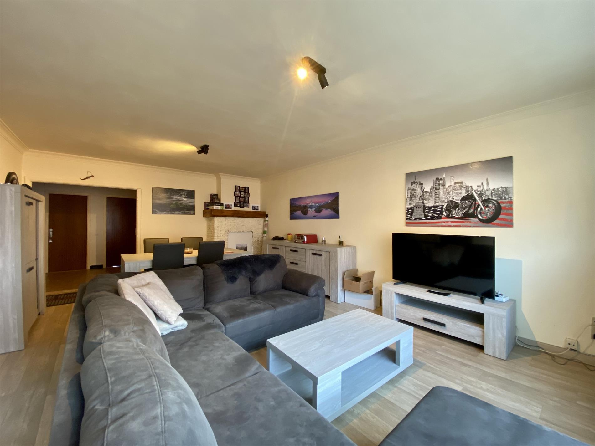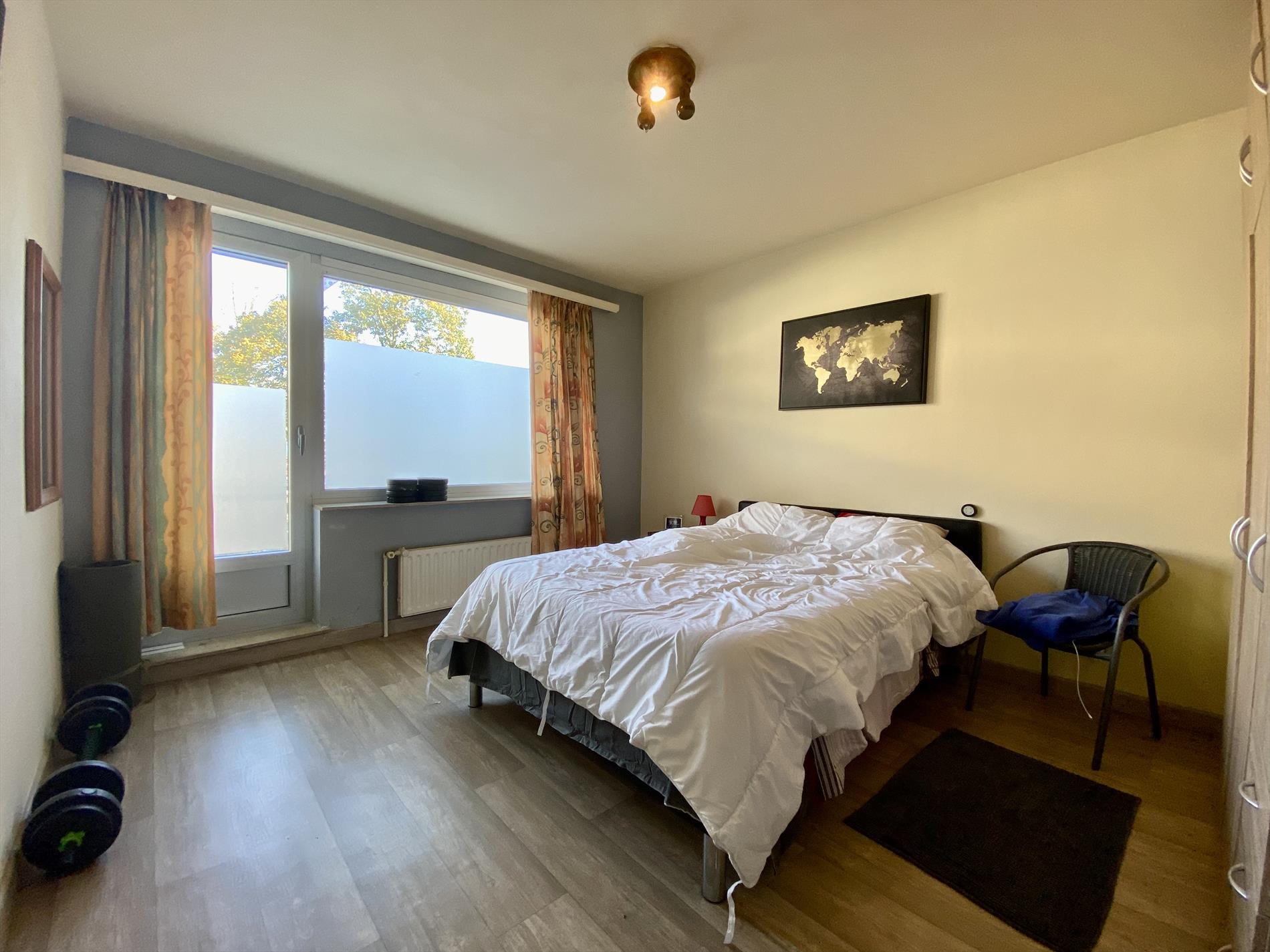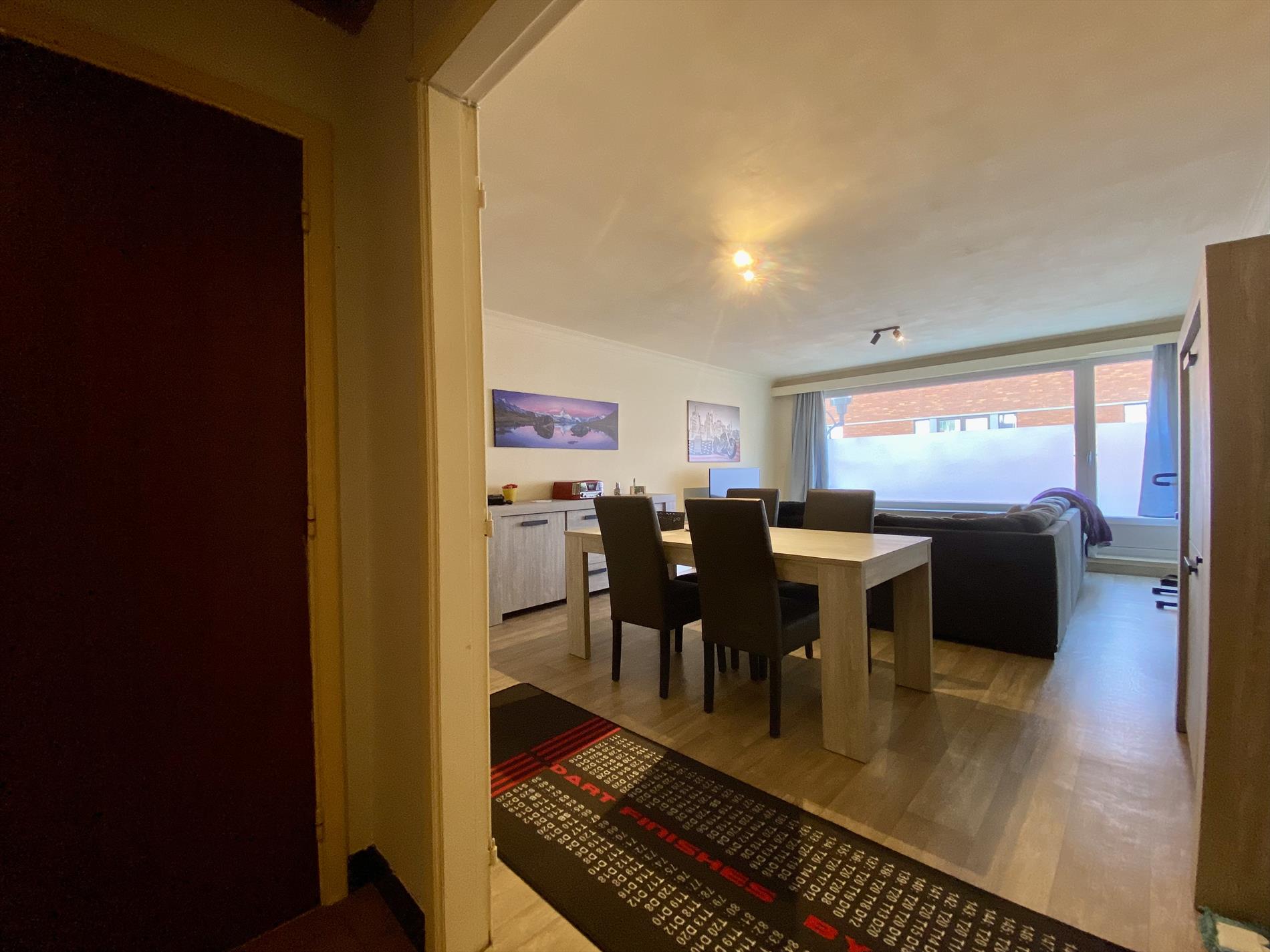 Dit gezellige appartement heeft een indeling als volgt: een ruime woonkamer die toegang geeft tot het terras (vooraan de woning) en een ingerichte keuken die aansluit op de berging. Verder beschikt het appartement over een moderne badkamer (met douche, lavabo en toilet) en twee slaapkamers. De grootste slaapkamer geeft toegang tot het tweede terras achteraan de woning. Het appartement beschikt over een garage en heeft centrale verwarming op gas.