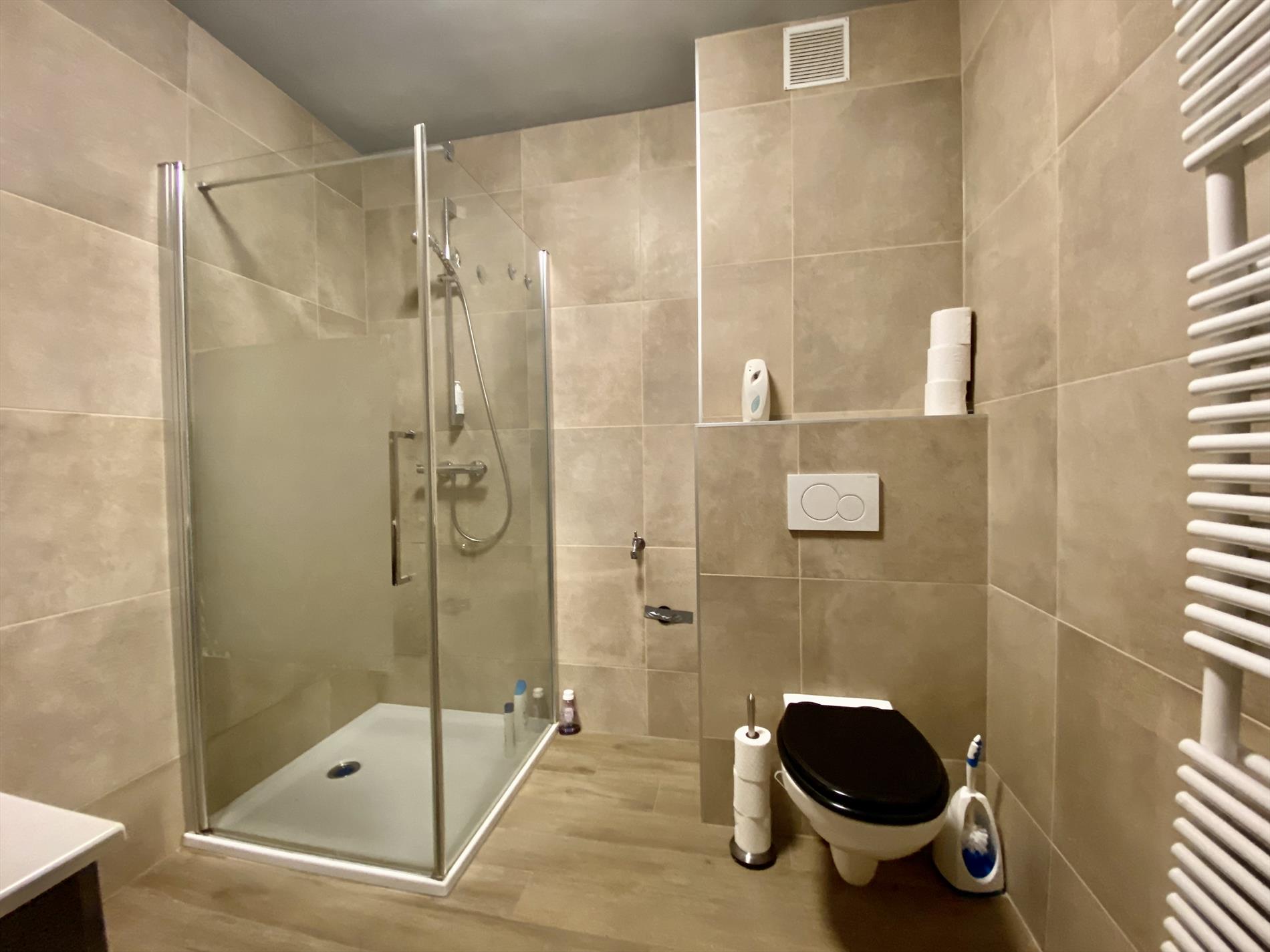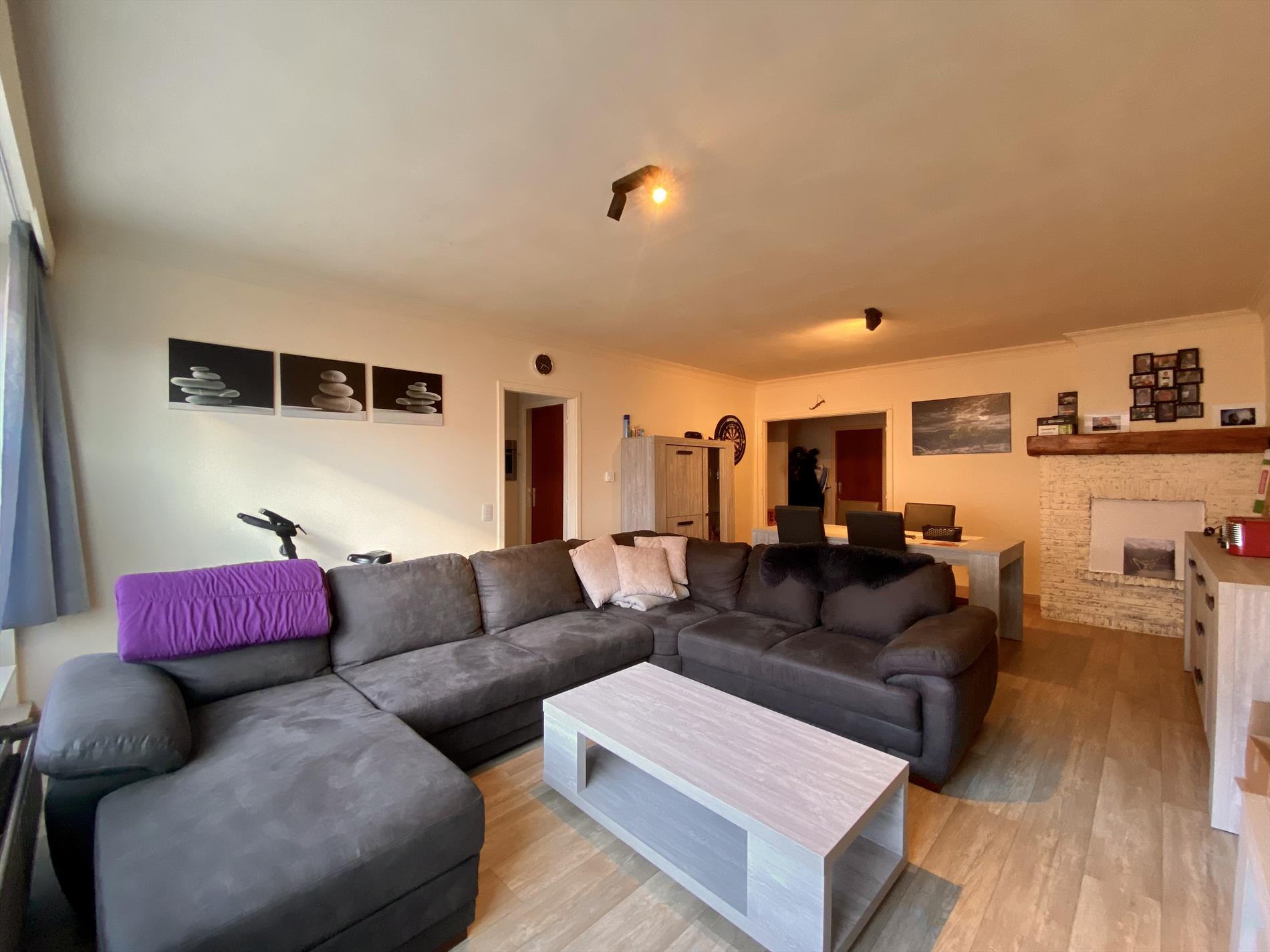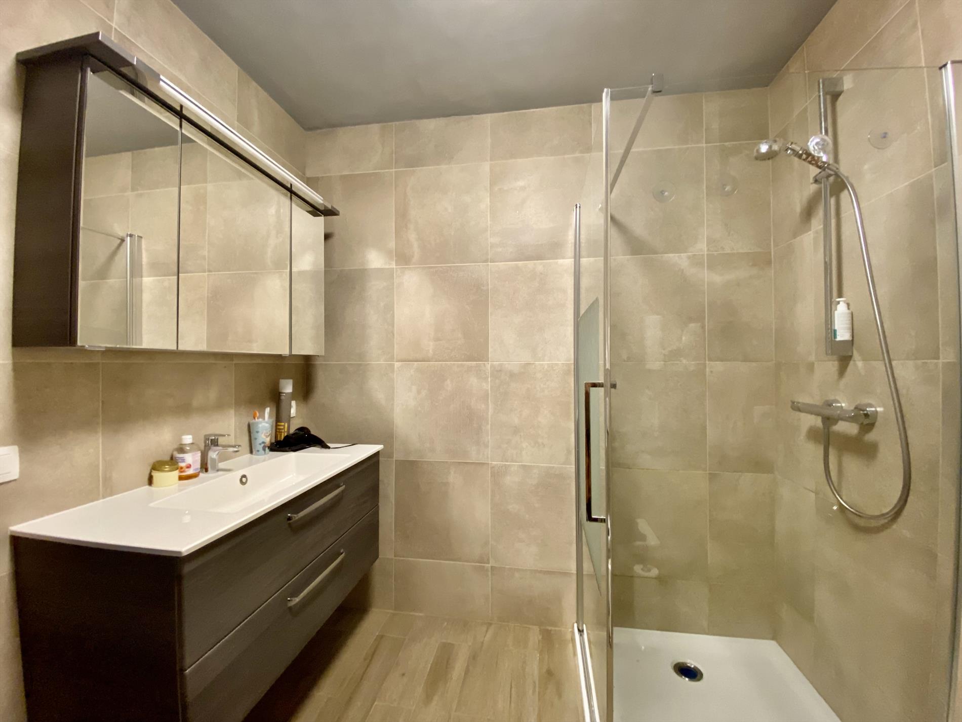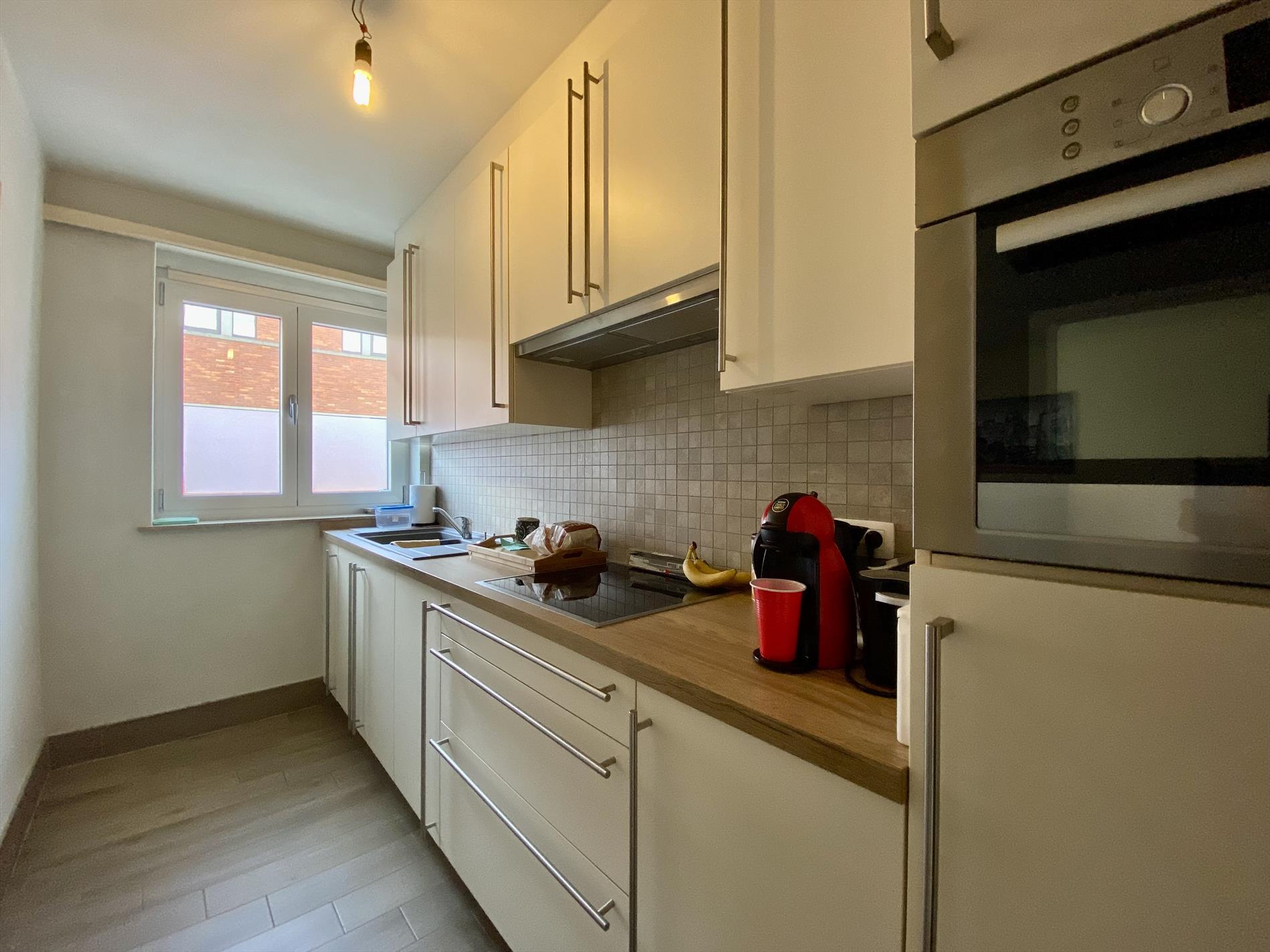 Dit gezellige appartement heeft een indeling als volgt: een ruime woonkamer die toegang geeft tot het terras (vooraan de woning) en een ingerichte keuken die aansluit op de berging. Verder beschikt het appartement over een moderne badkamer (met douche, lavabo en toilet) en twee slaapkamers. De grootste slaapkamer geeft toegang tot het tweede terras achteraan de woning. Het appartement beschikt over een garage en heeft centrale verwarming op gas.