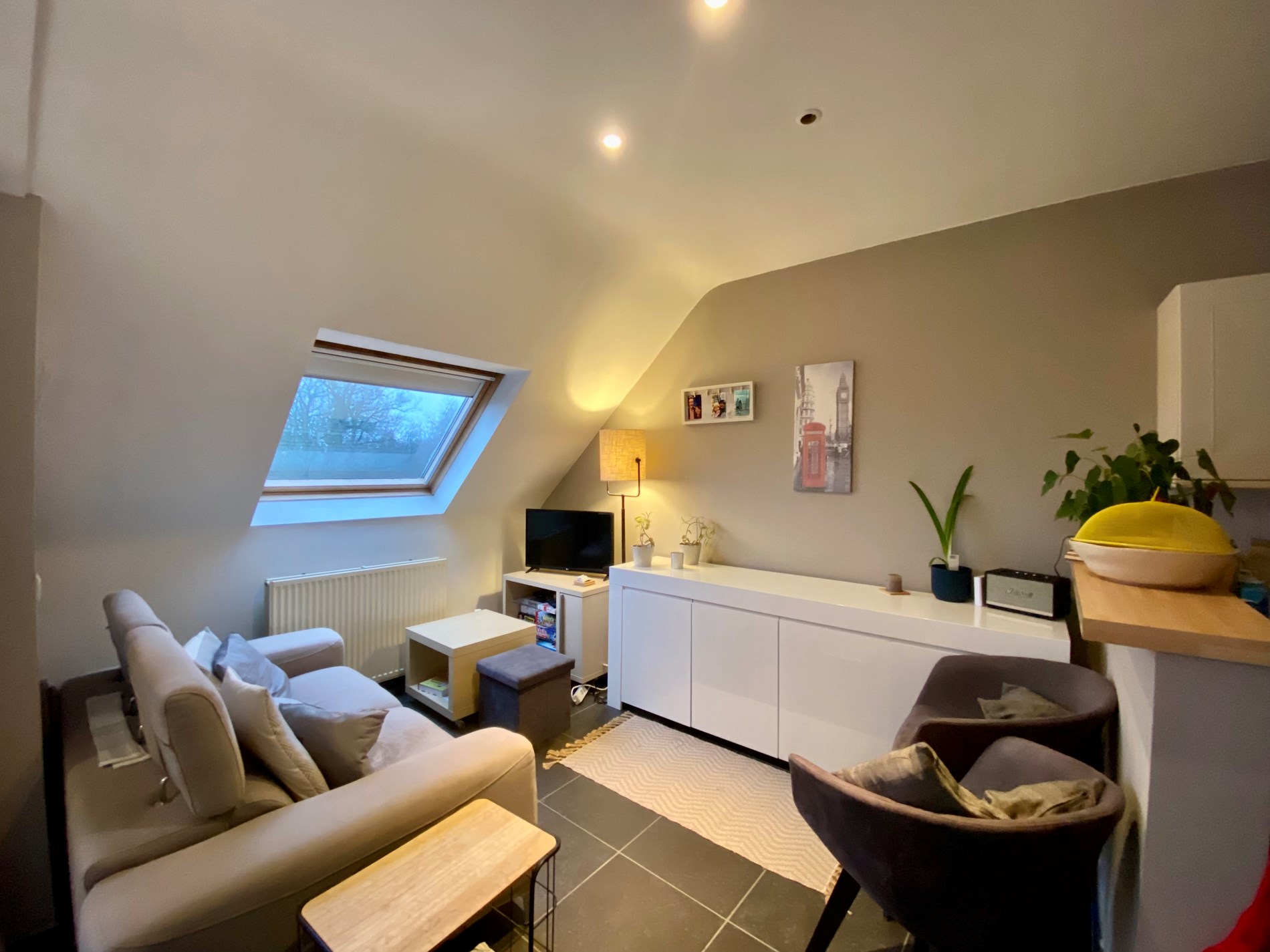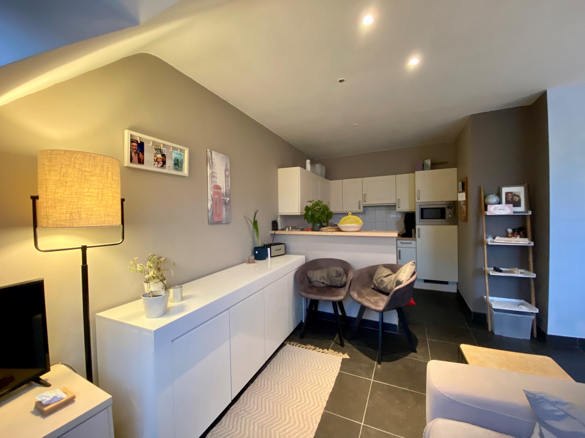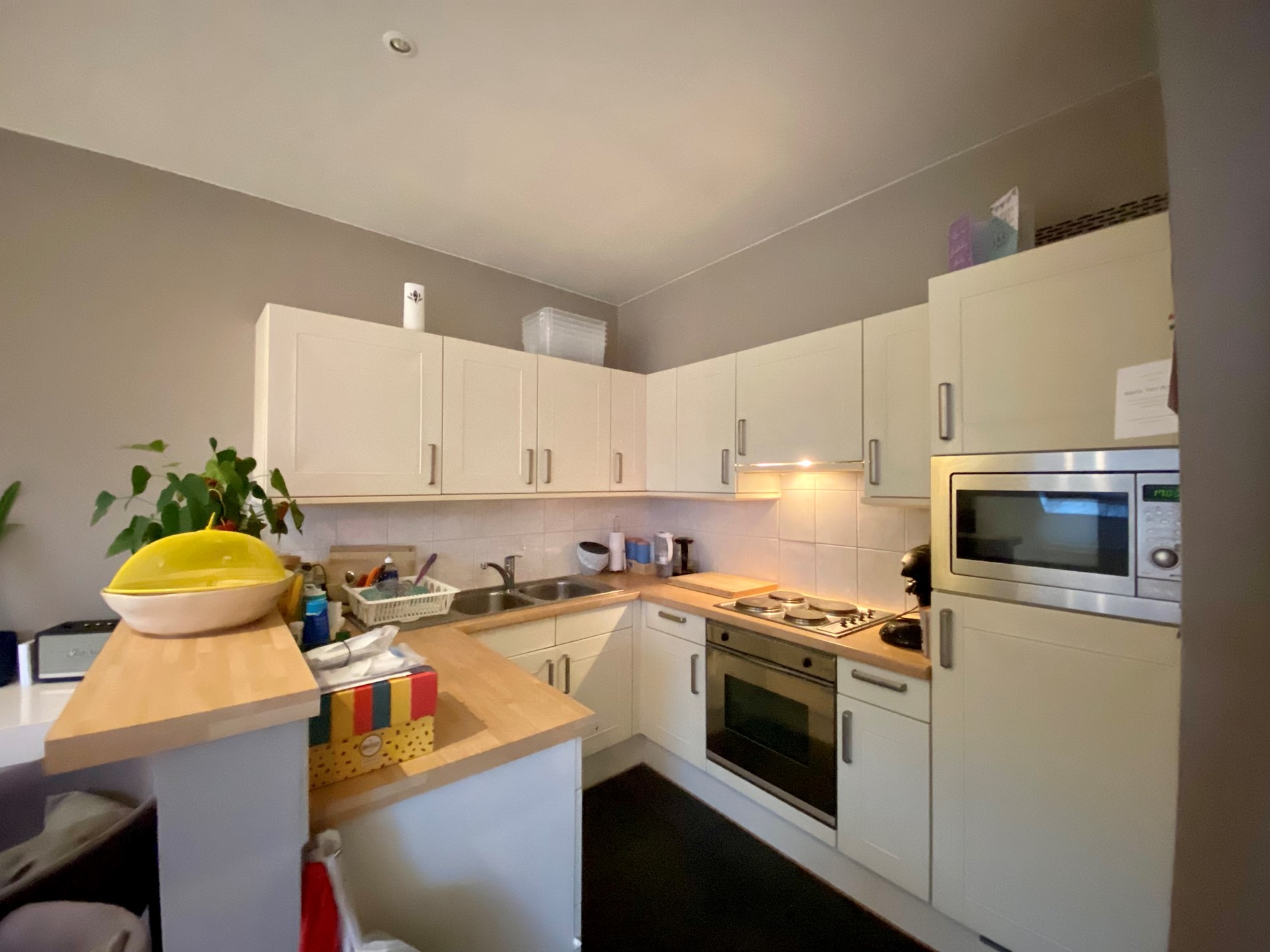een gezellige woonkamer die aansluit op de ingebouwde keuken met alle toestellen (fornuis, oven, ijskast en dampkap).