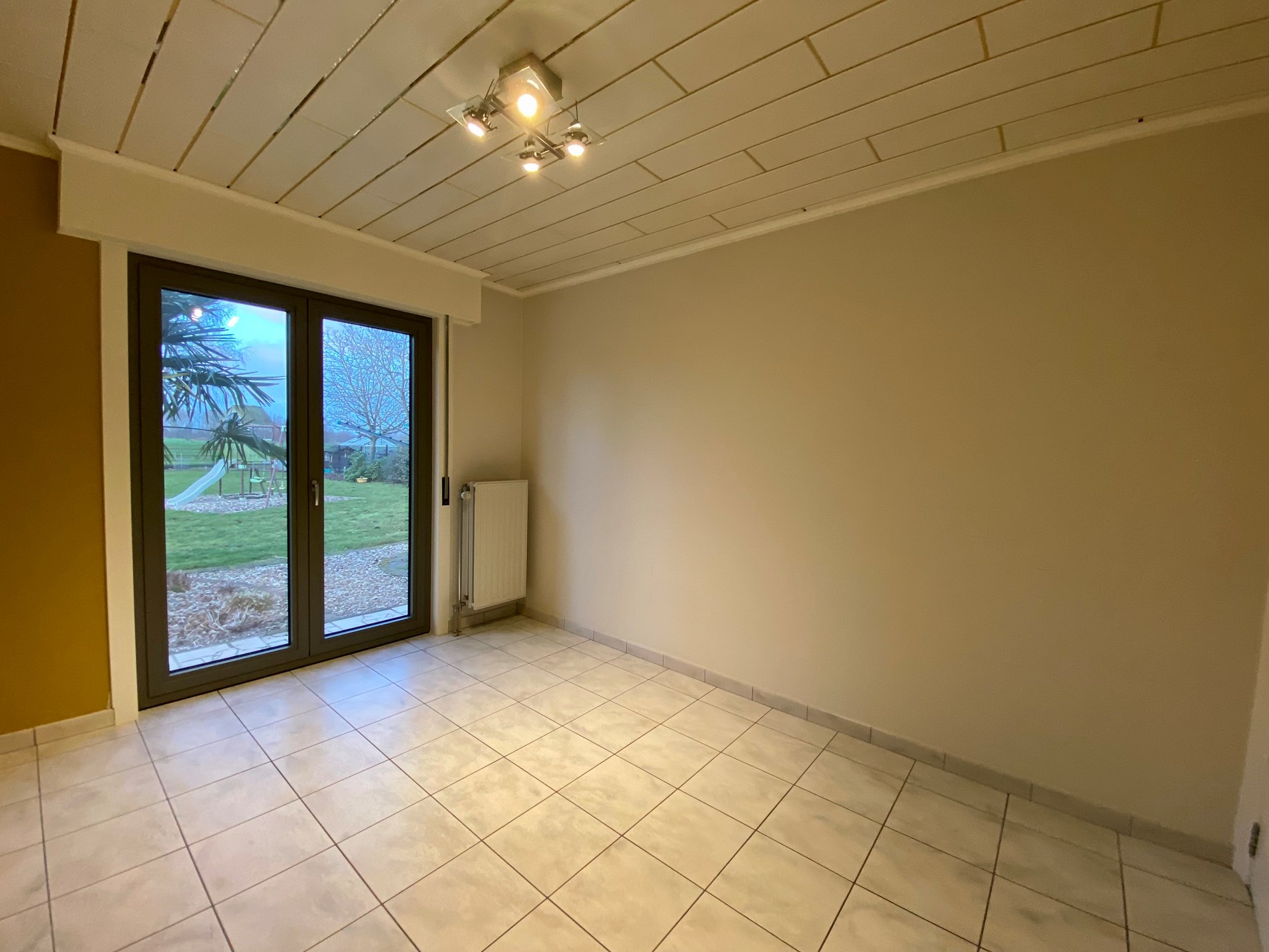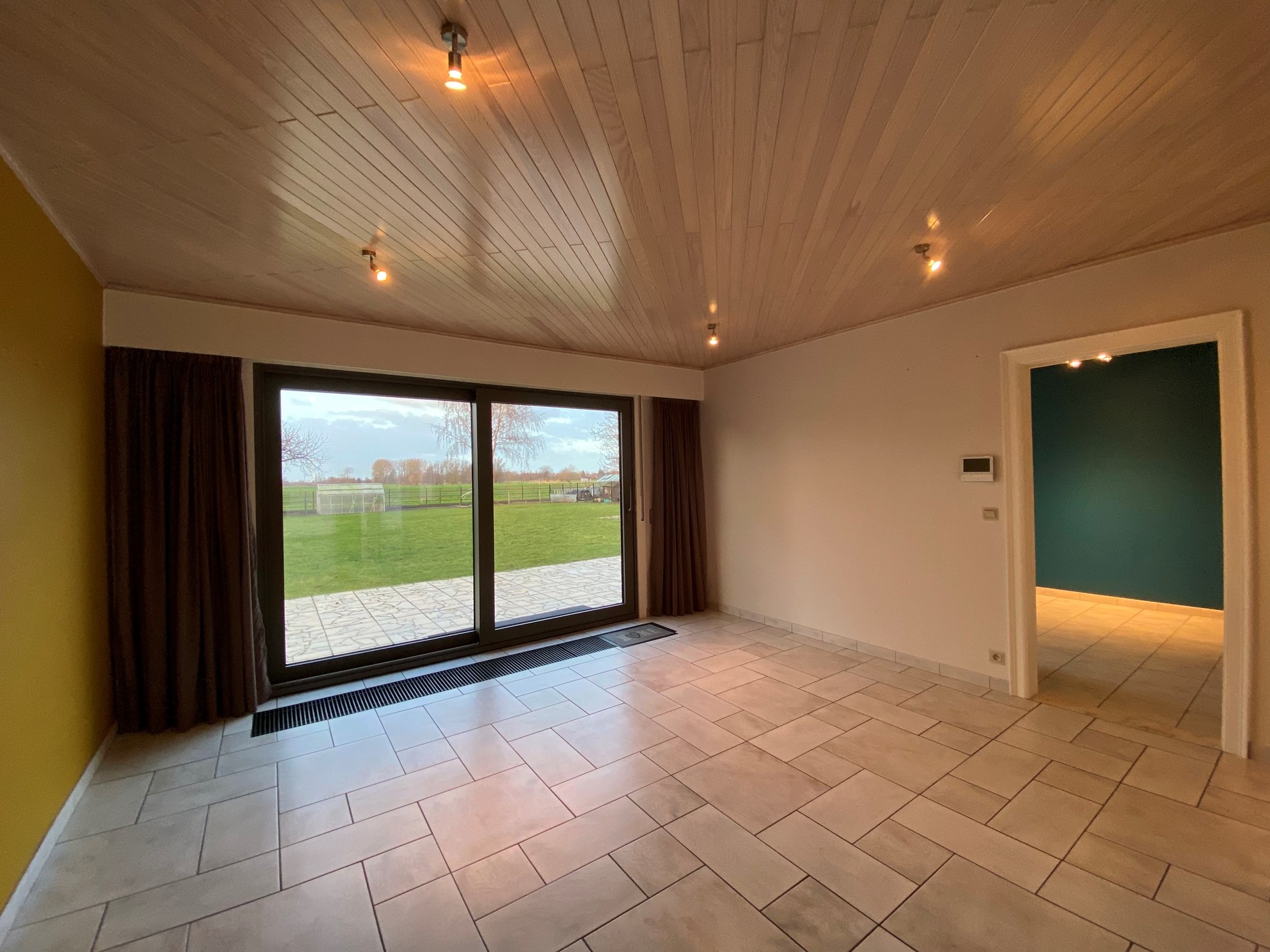 Achteraan de woning is een zonneluifel aanwezig en een schuifraam aan de woonkamer.