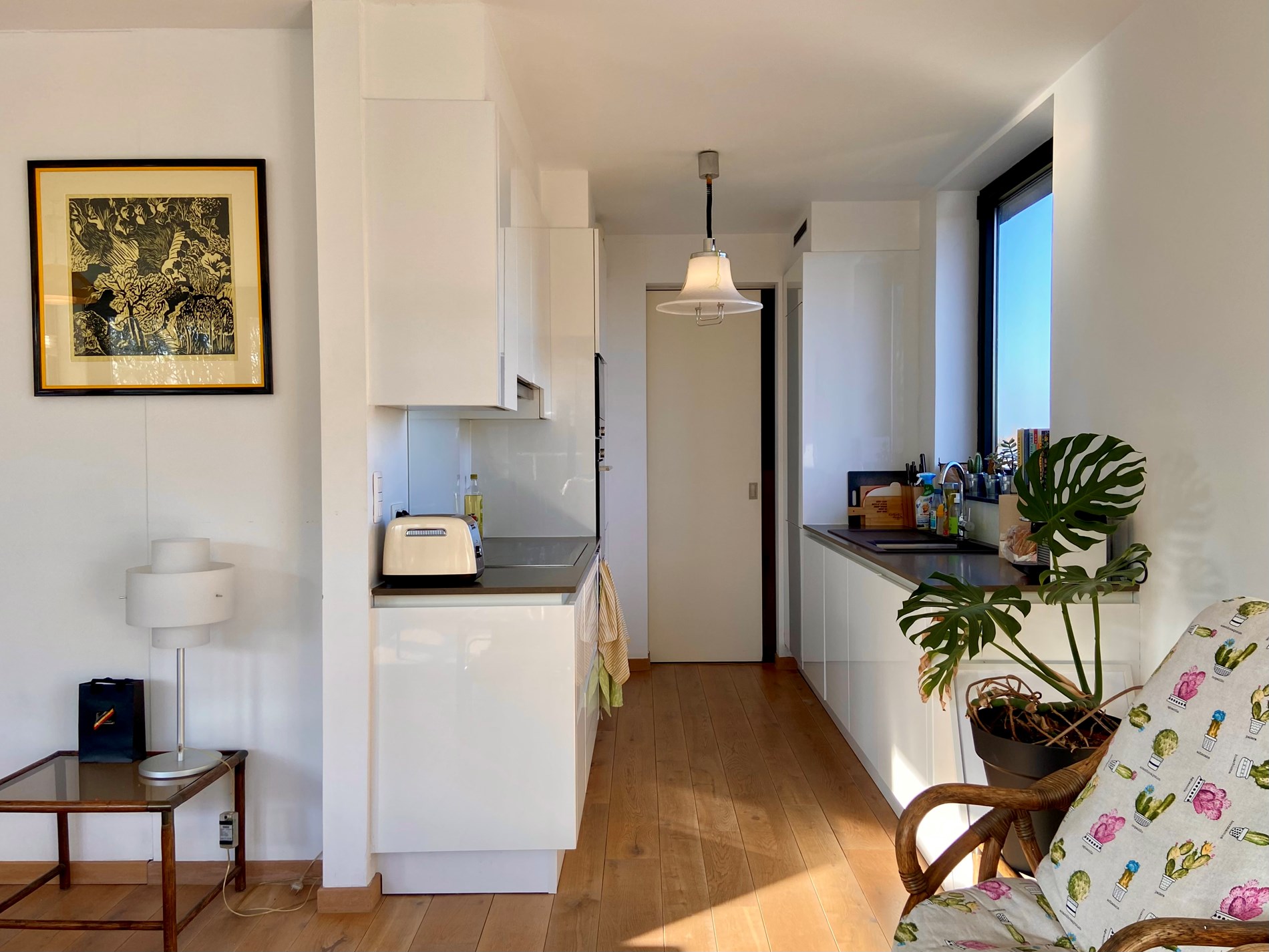 Bij het binnenkomen word je verwelkomd in een lichtrijke woonkamer met stijlvol parket, die naadloos overgaat in de volledig ingerichte keuken. De keuken is uitgerust met een keramische kookplaat, combi-oven, microgolfoven, dampkap, ijskast, diepvries en vaatwasser.