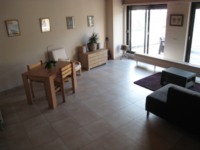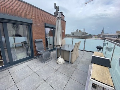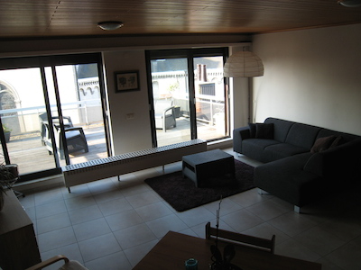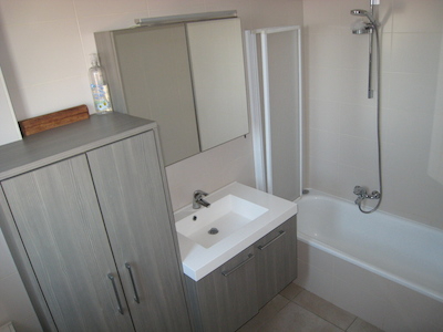 badkamer met ingebouwd meubel met lavabo en spiegelopzet en ligbad, zeer groot terras, nieuwe ramen.