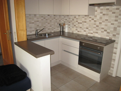 volledig ingerichte keuken met toestellen: elektrische kookplaat, ijskast, dampkap, oven, geen vaatwasser.