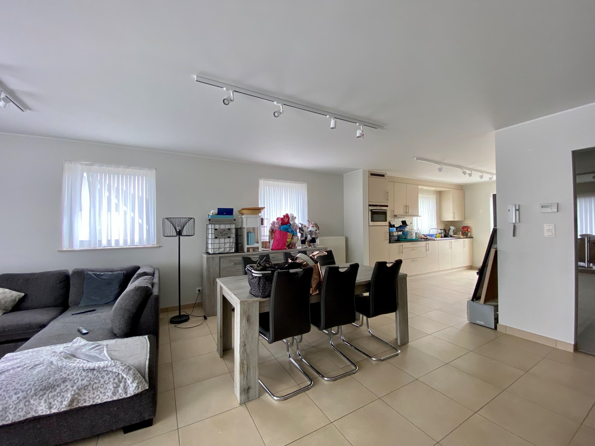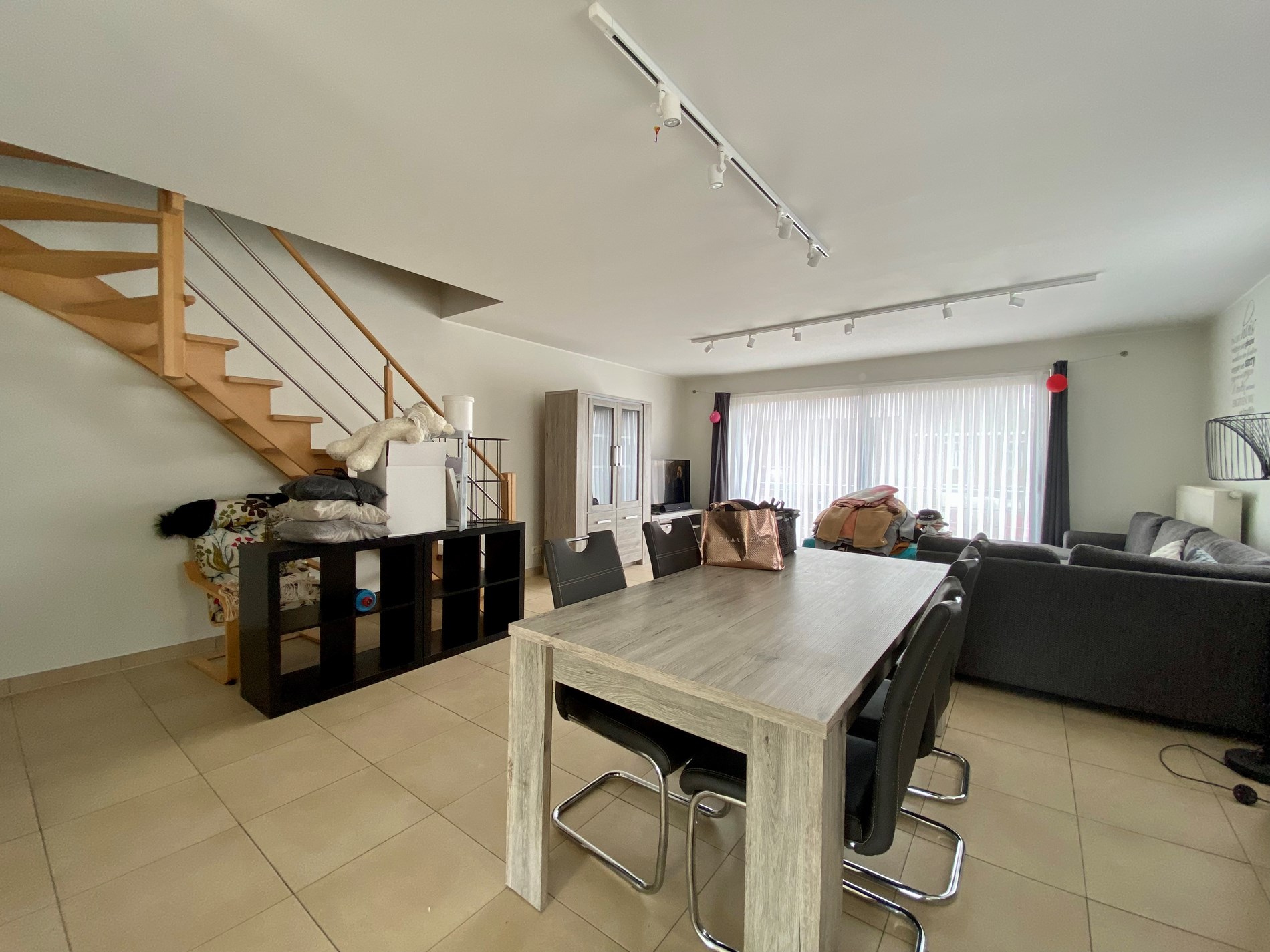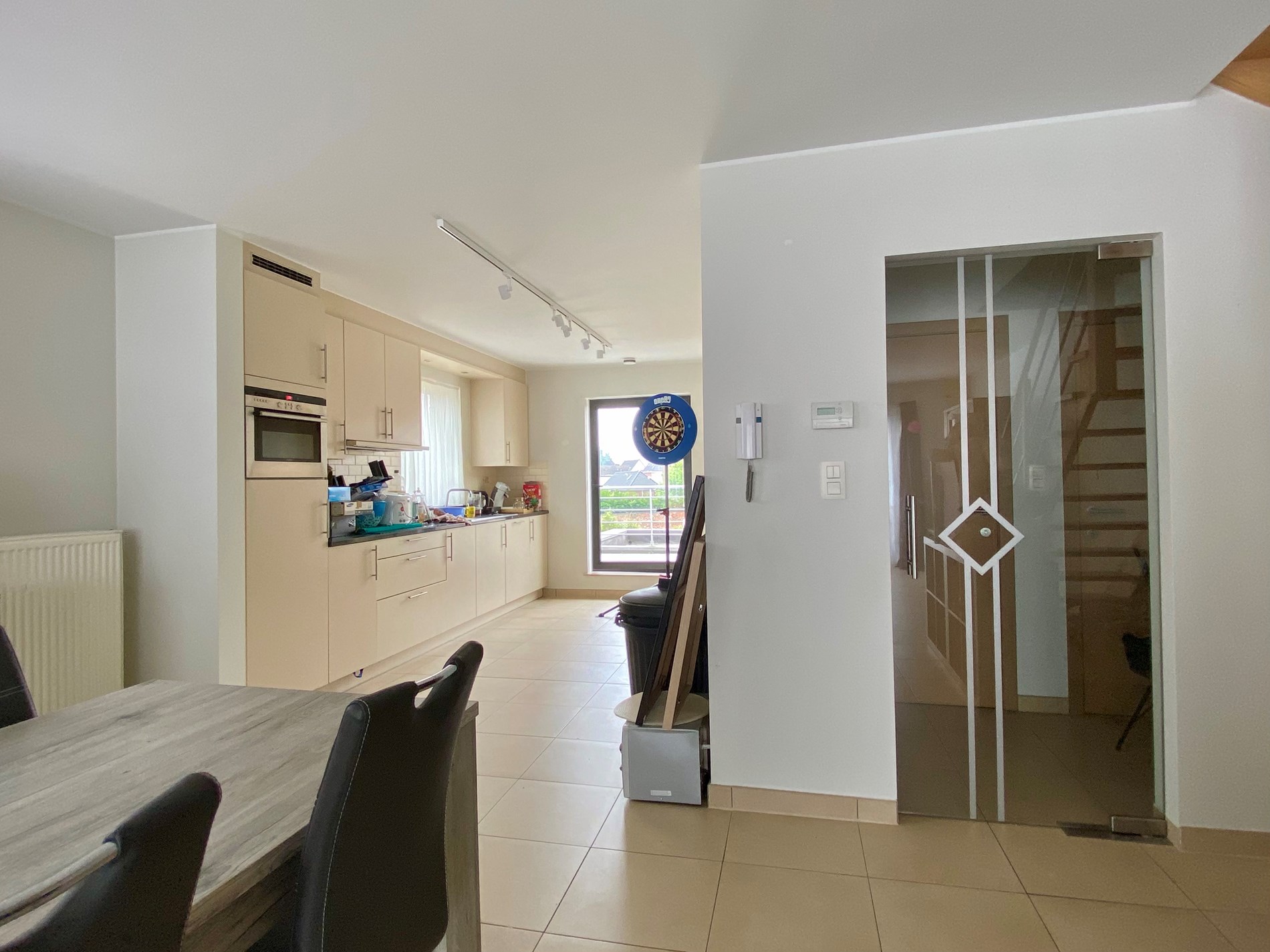 een inkomhal met gastentoilet, een woonkamer die aansluit op de ingebouwde keuken met alle toestellen: fornuis met keramische platen, combi-oven, ijskast, dampkap en vaatwasser. Verder geeft de keuken toegang tot de berging en het ruime terras.