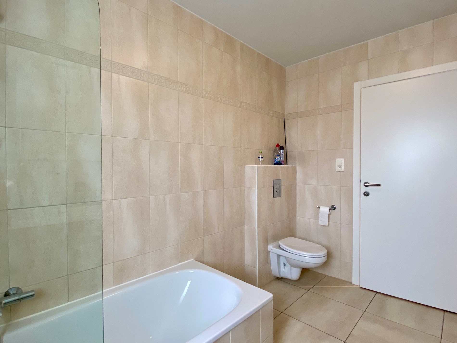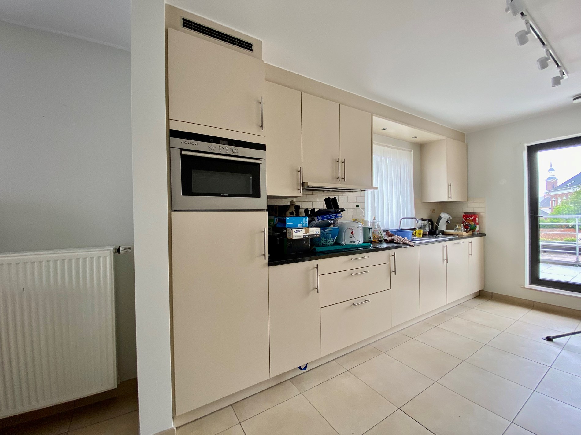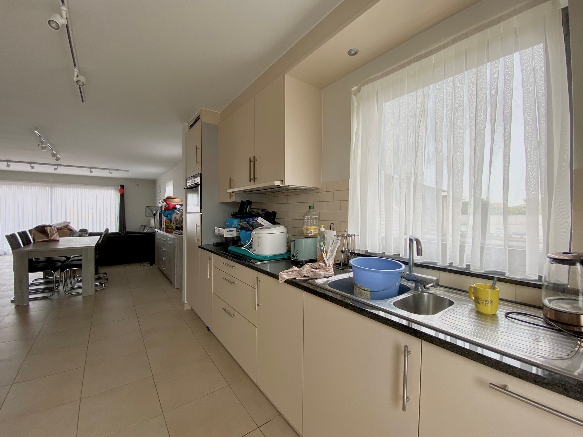 een inkomhal met gastentoilet, een woonkamer die aansluit op de ingebouwde keuken met alle toestellen: fornuis met keramische platen, combi-oven, ijskast, dampkap en vaatwasser. Verder geeft de keuken toegang tot de berging en het ruime terras.