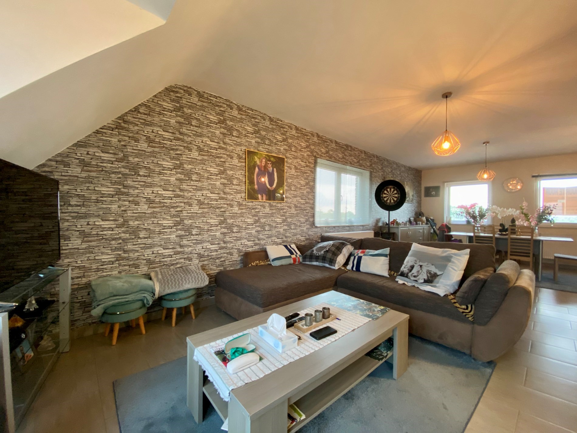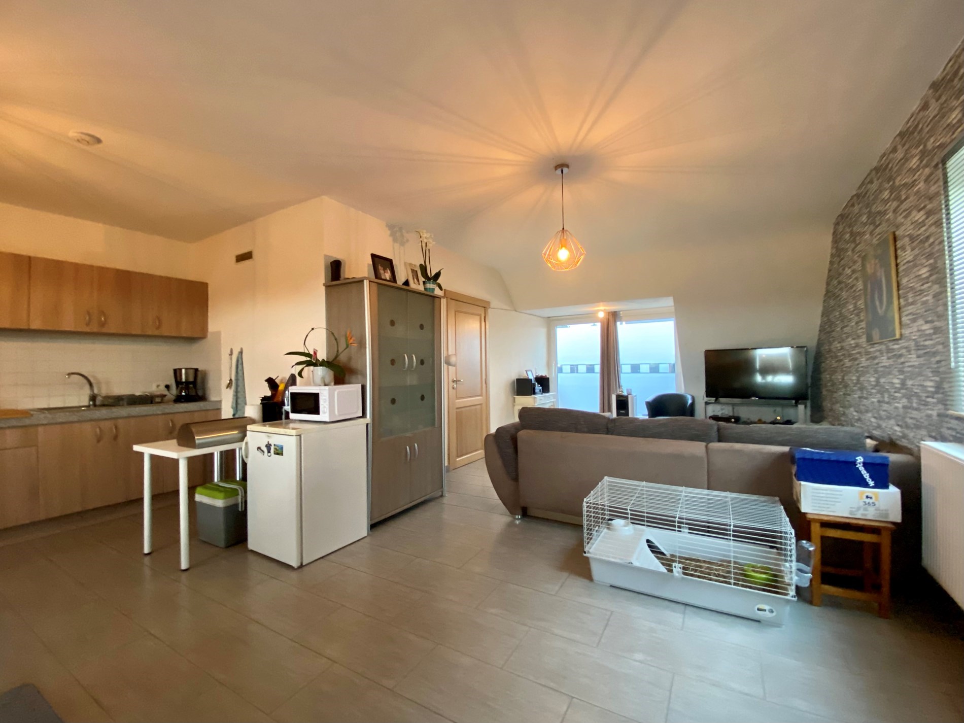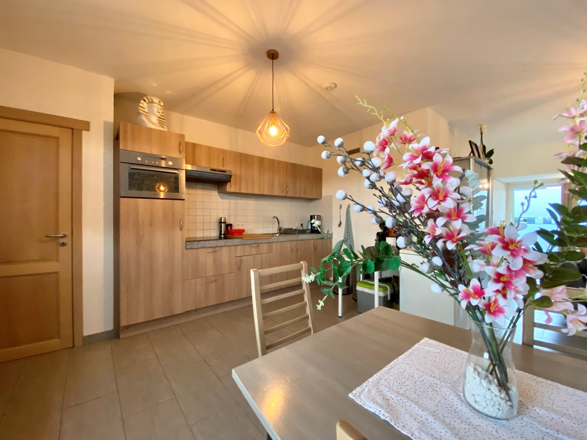 De ruime woonkamer sluit aan op de volledig ingerichte keuken en bied toegang tot het zeer ruime terras.