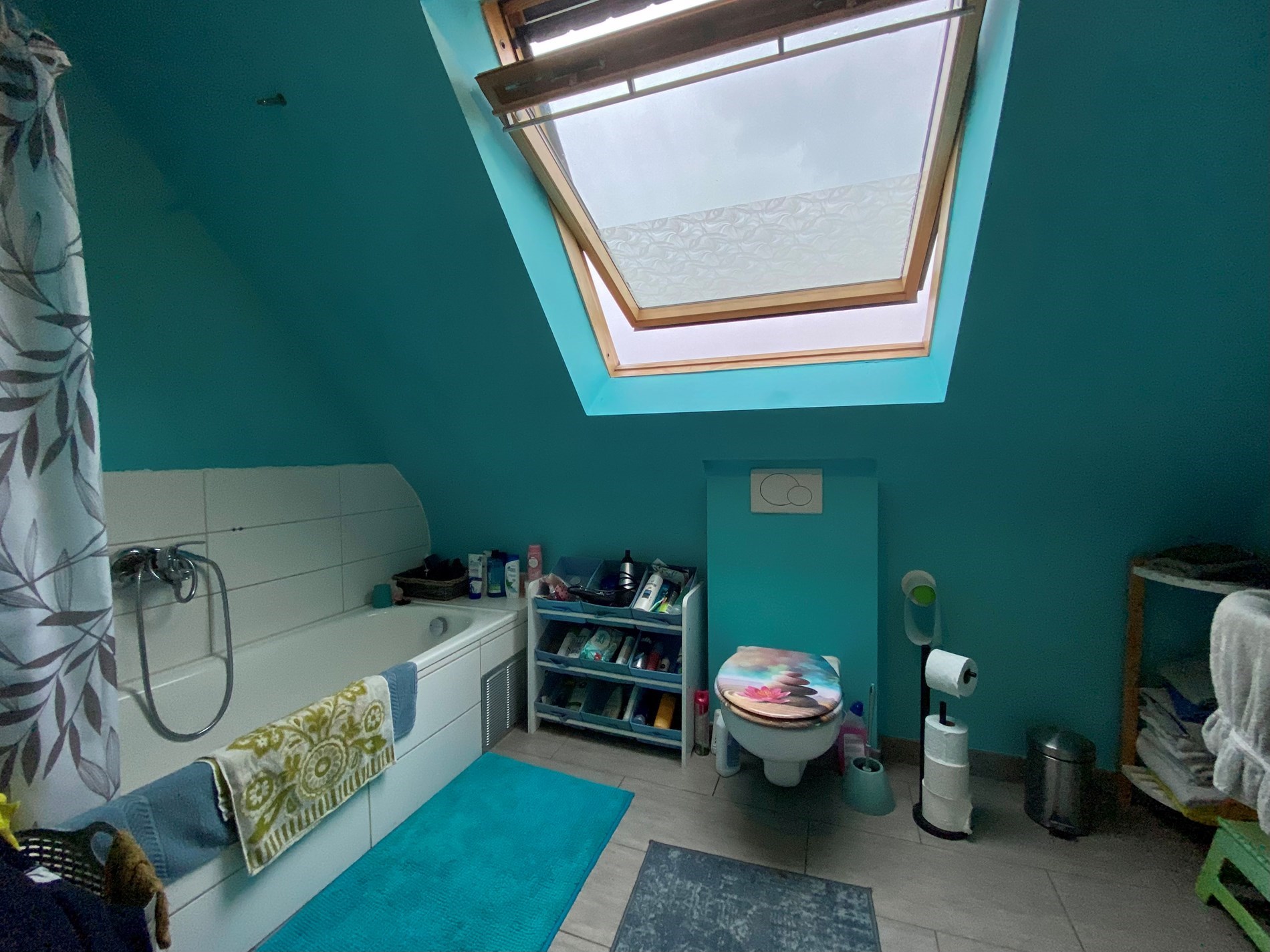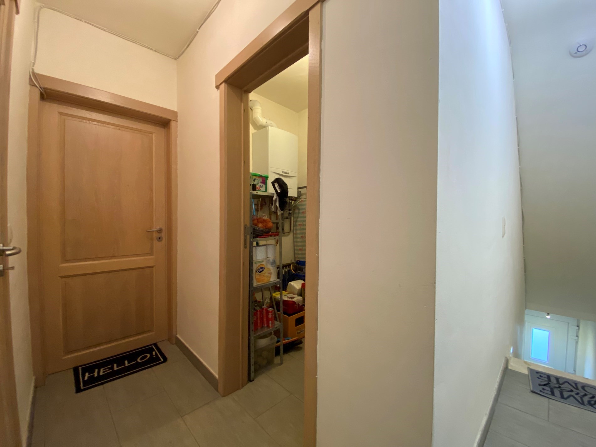 Via de eerste trap naar boven kom je in de inkomhal. Via de inkomhal kan je naar de woonkamer, berging en badkamer. De badkamer is uitgerust met toilet, ligbad en lavabo.