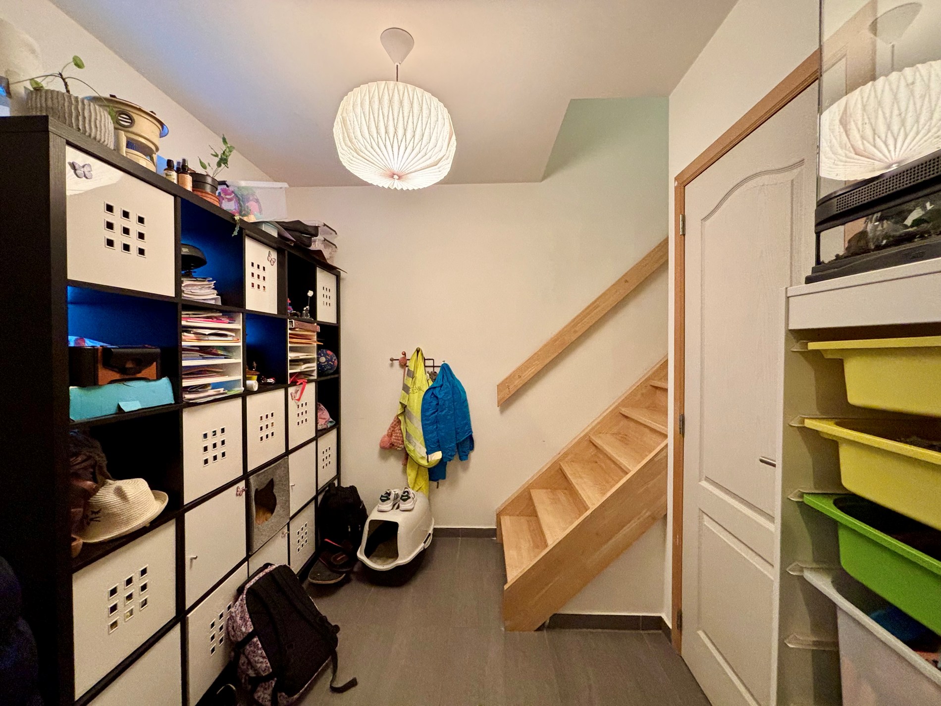 een ruime woonkamer die aansluit op de volledig uitgeruste keuken (met oven, microgolf, kookvuur, dampkap en plaats voor vaatwasser. Verder beschikt de benedenverdieping over een berging en een gastentoilet.