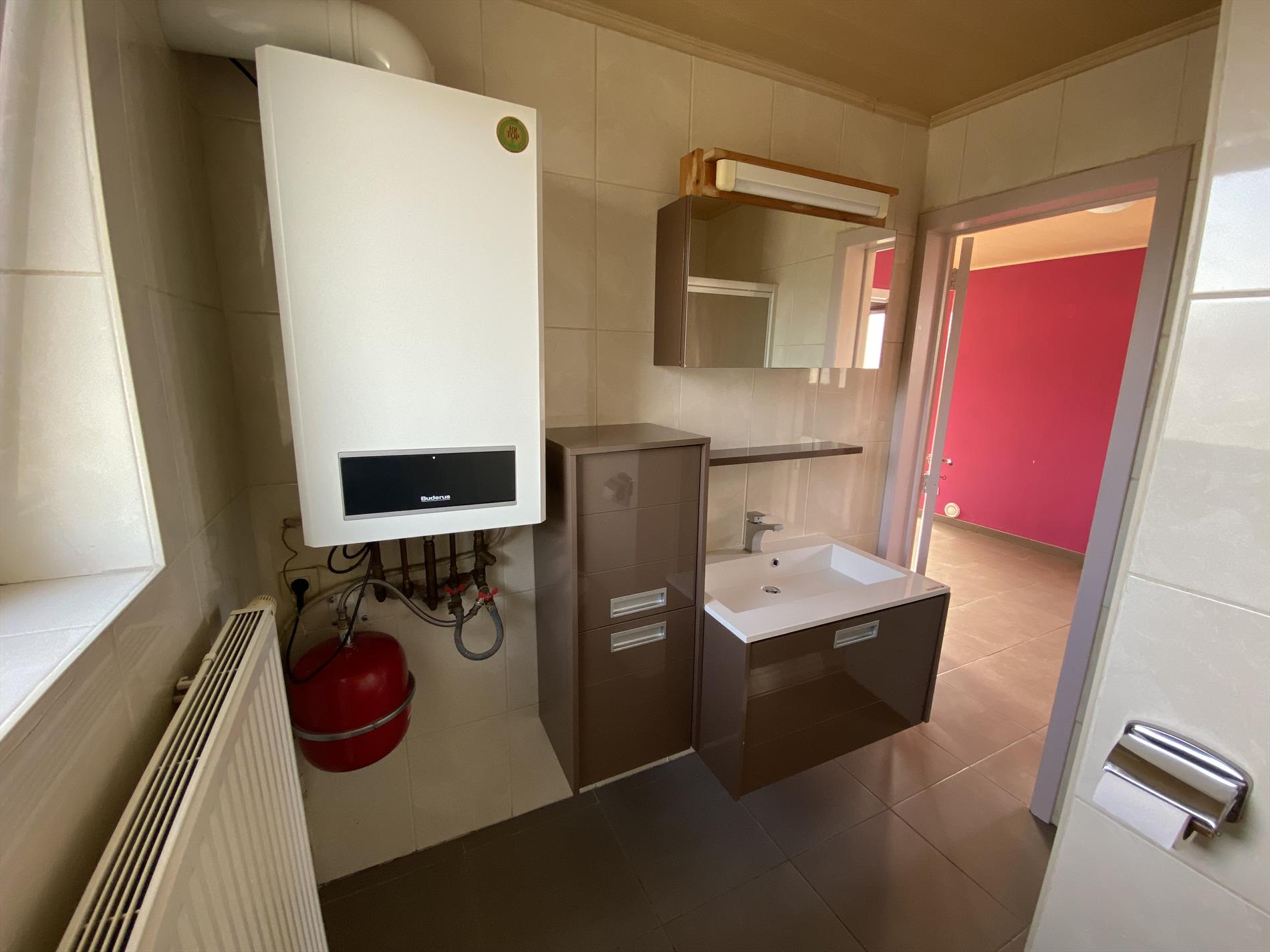 badkamer met douche, lavabomeubel en toilet,