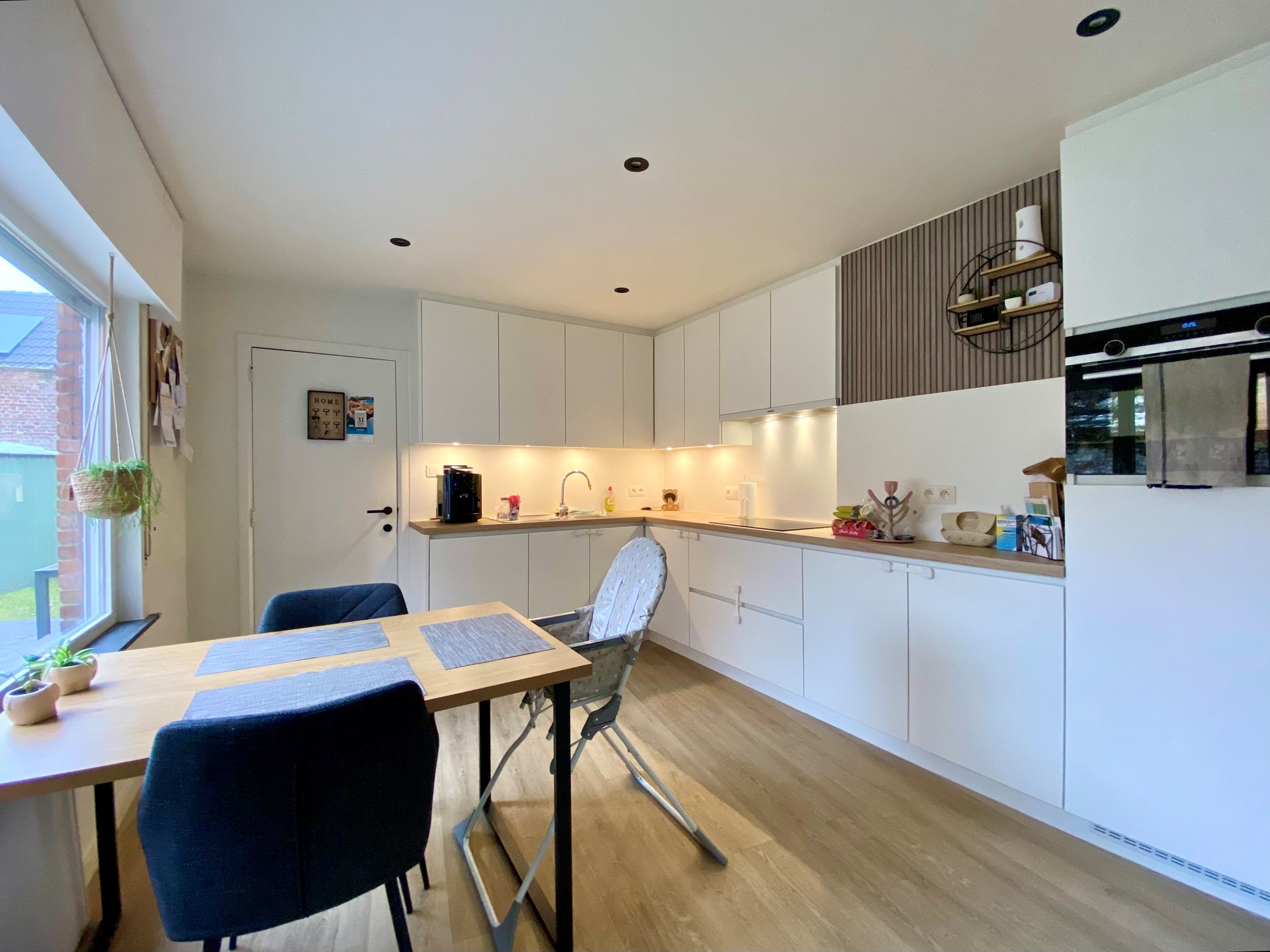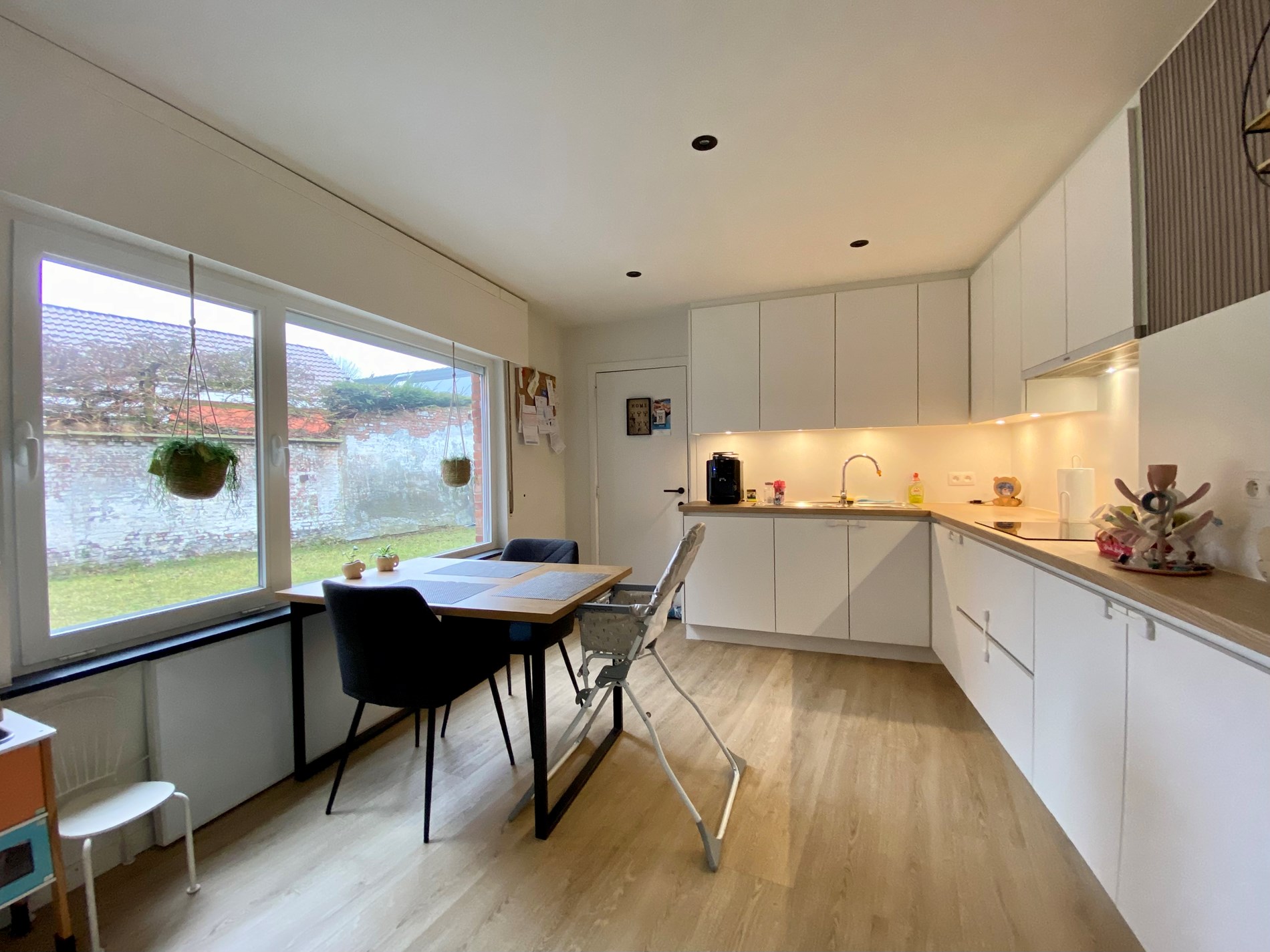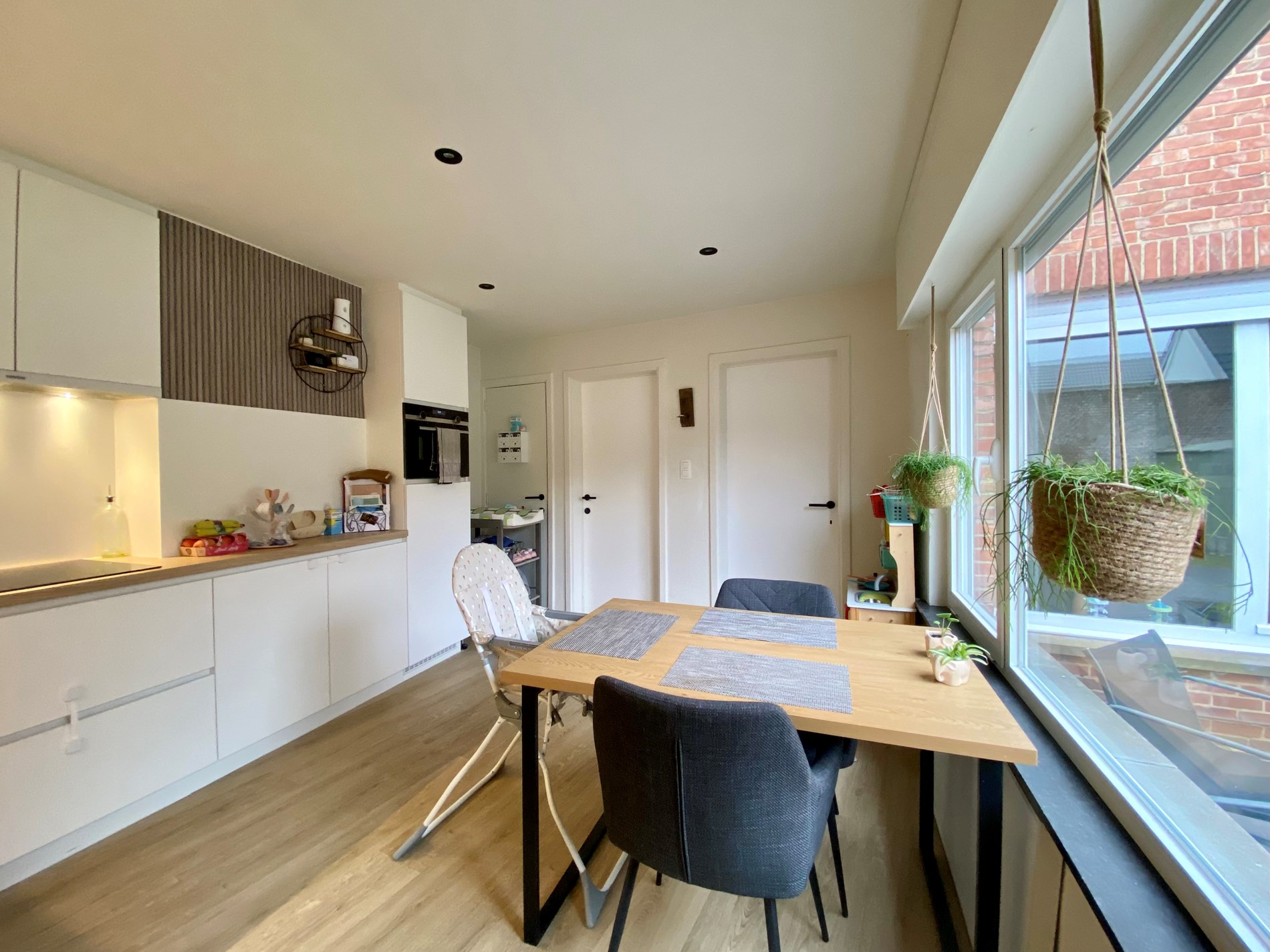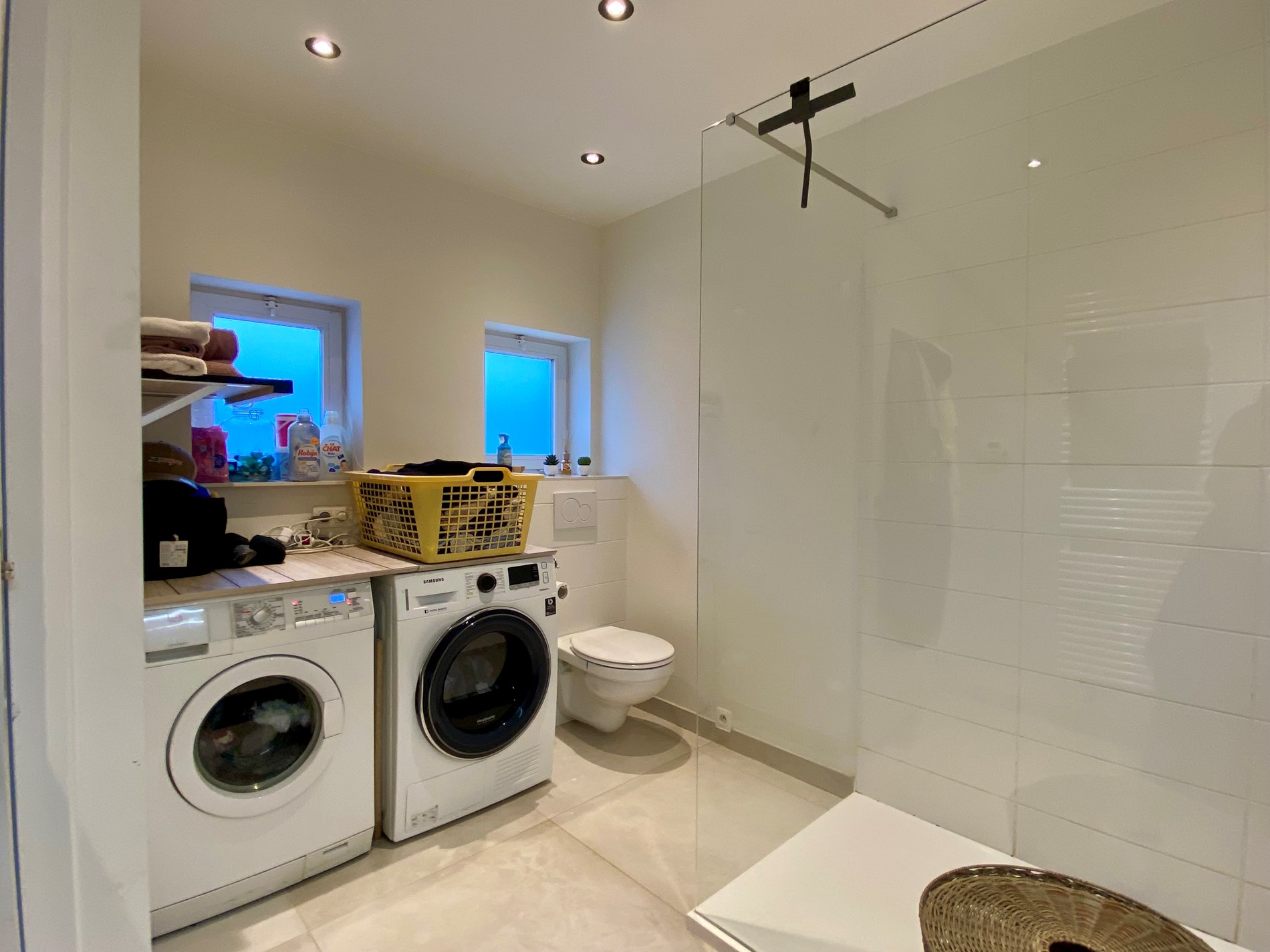 Aansluitend bevindt zich de moderne keuken, praktisch ingericht en volledig uitgerust met een kookvuur, dampkap, ijskast en oven. Naast de keuken is er een handige spender/voorraadkast. Grenzend aan de keuken bevindt zich de achteruitgang naar de tuin en de gerenoveerde badkamer, deze is uitgerust met een lavabo, inloopdouche, toilet en aansluitingen voor een wasmachine en droogkast.