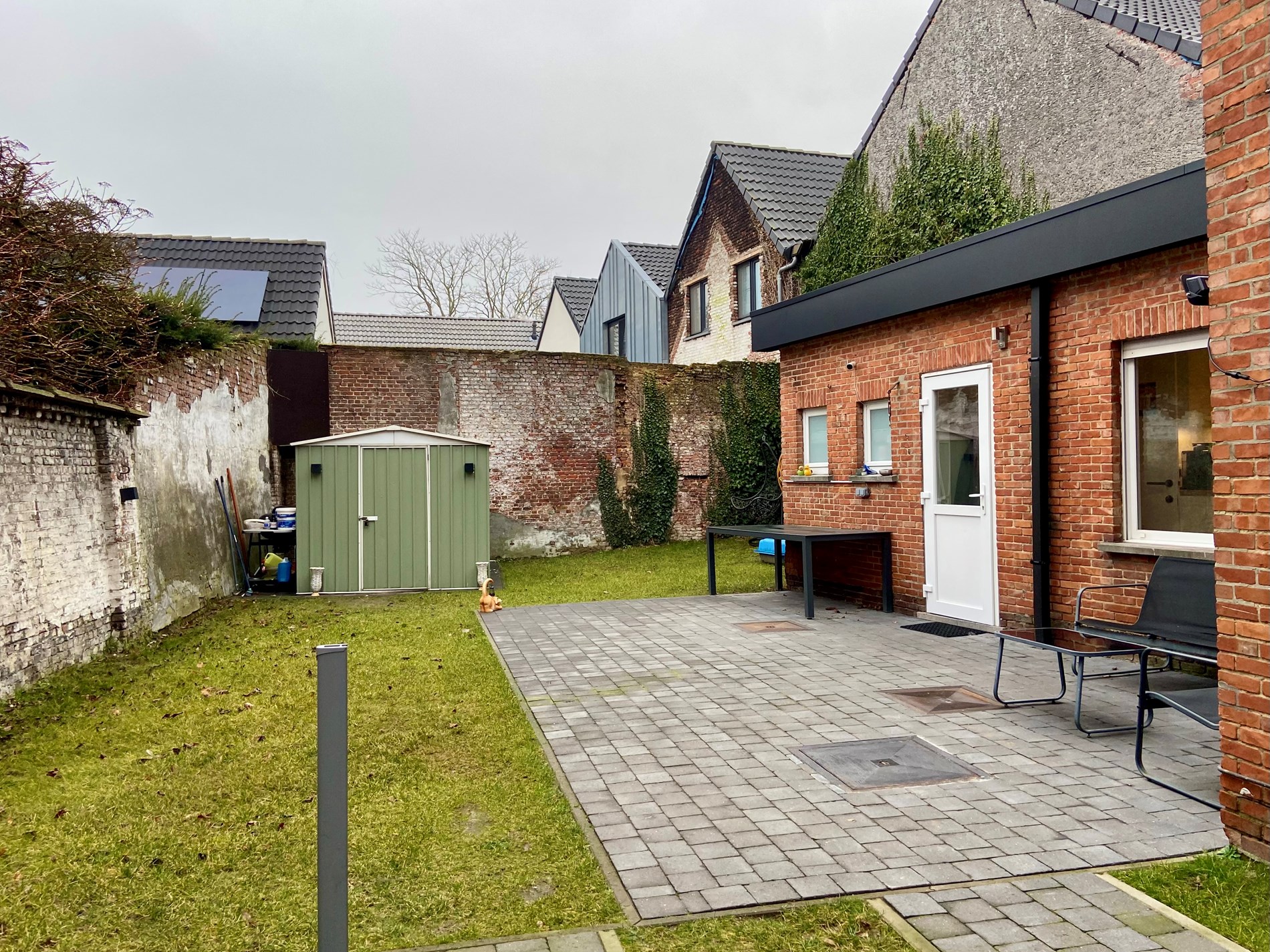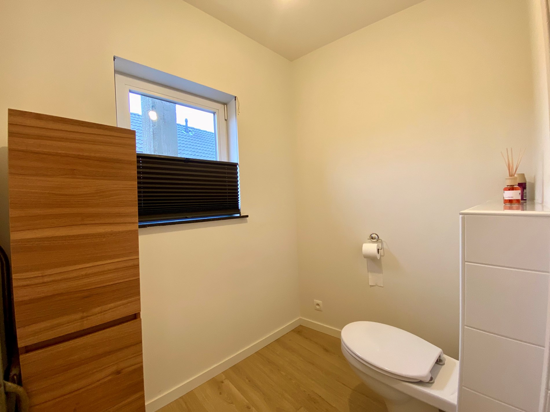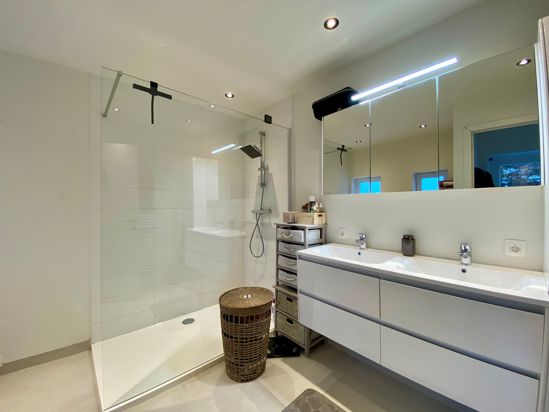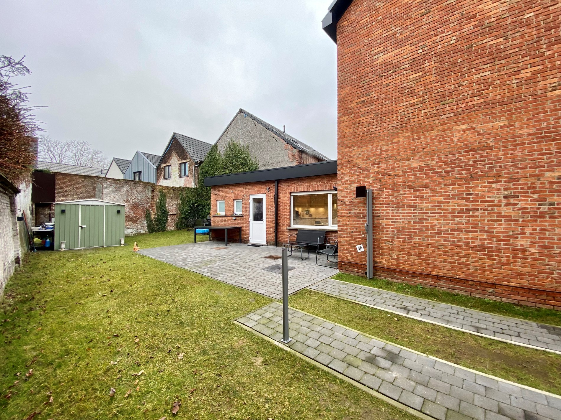 Aansluitend bevindt zich de moderne keuken, praktisch ingericht en volledig uitgerust met een kookvuur, dampkap, ijskast en oven. Naast de keuken is er een handige spender/voorraadkast. Grenzend aan de keuken bevindt zich de achteruitgang naar de tuin en de gerenoveerde badkamer, deze is uitgerust met een lavabo, inloopdouche, toilet en aansluitingen voor een wasmachine en droogkast.