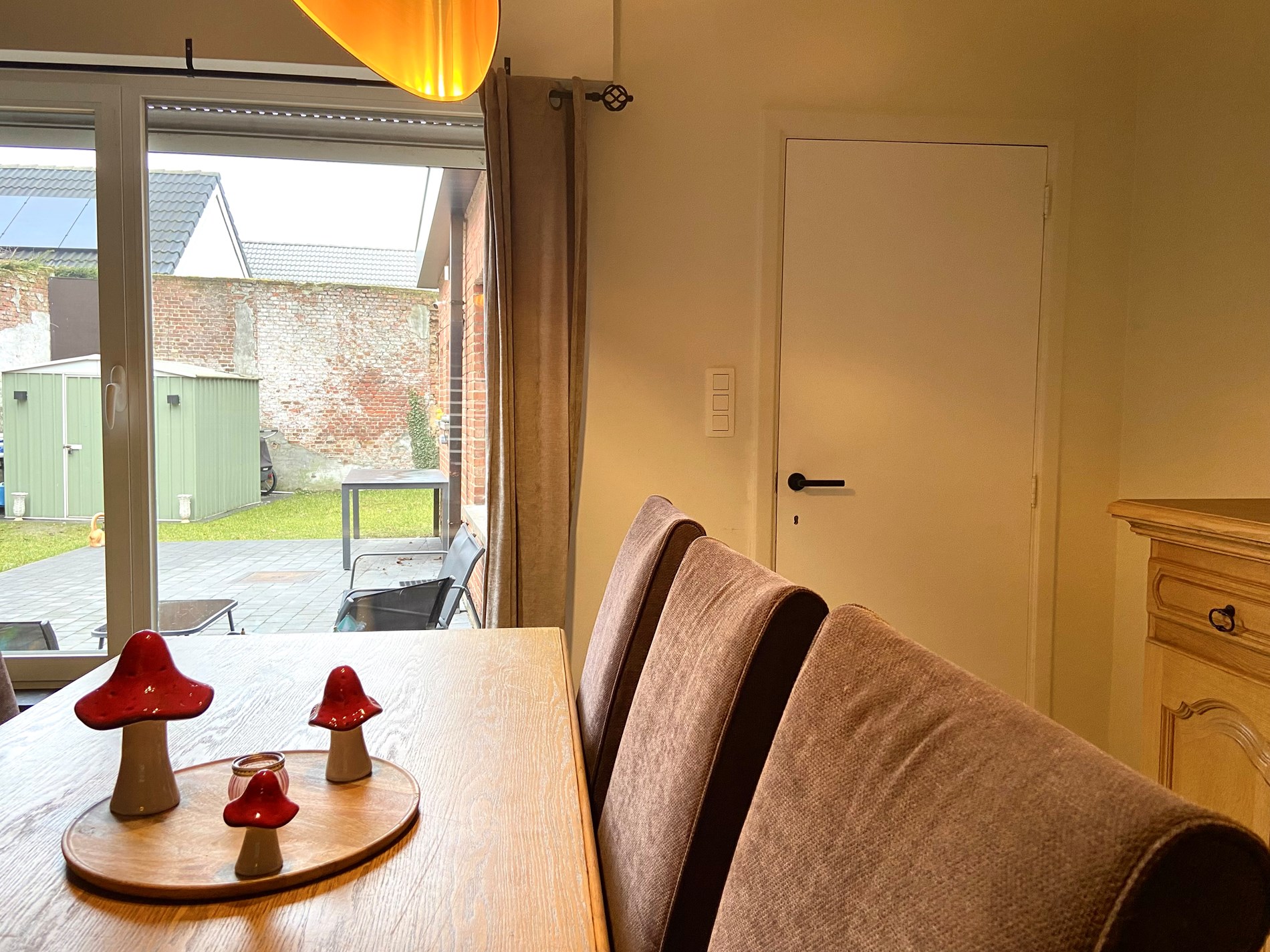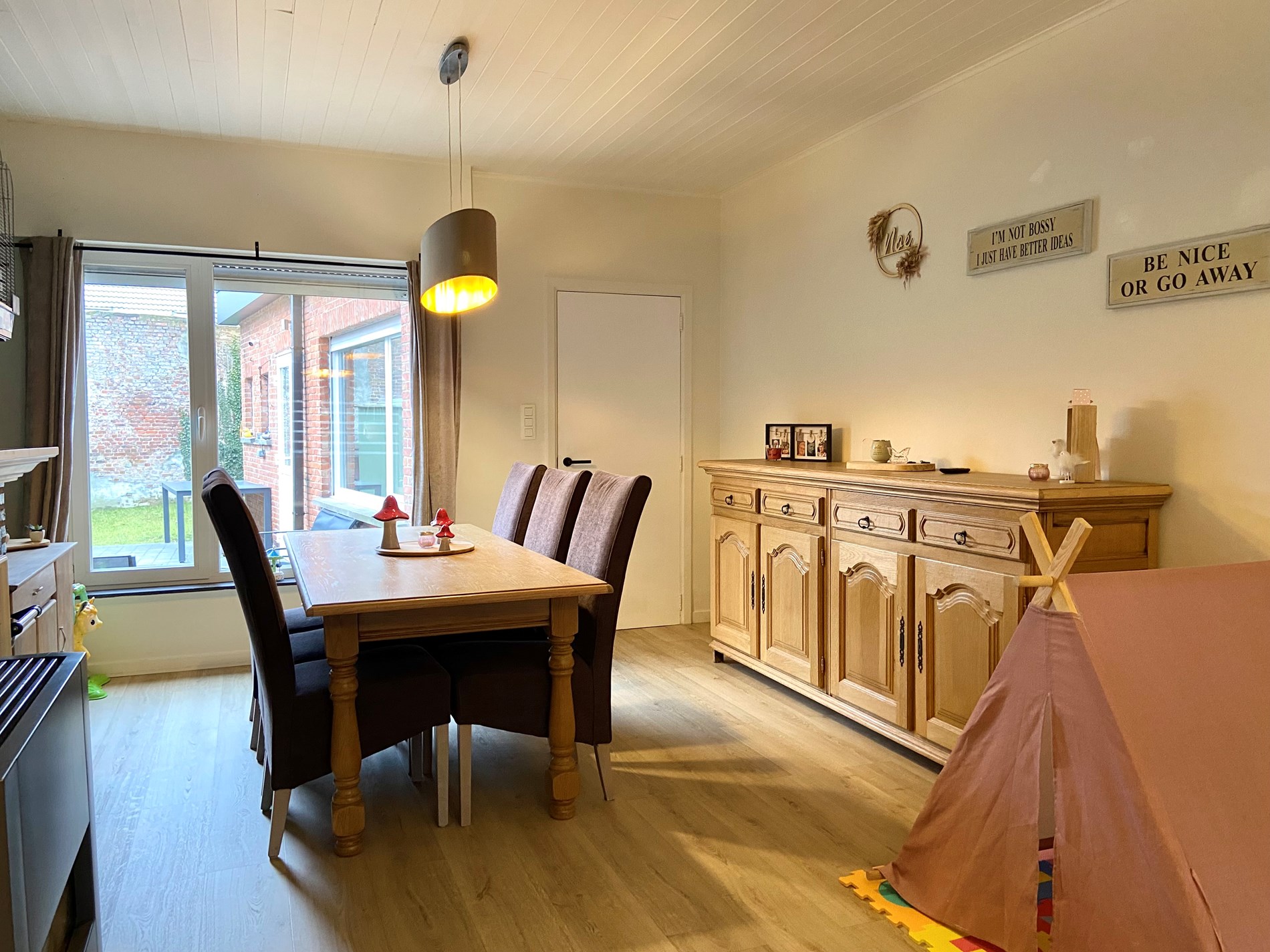 Van hieruit loop je vlot door naar de lichtrijke woonkamer, waar grote ramen zorgen voor een mooi zicht op de tuin. De kachel op aardgas brengt extra warmte en sfeer.