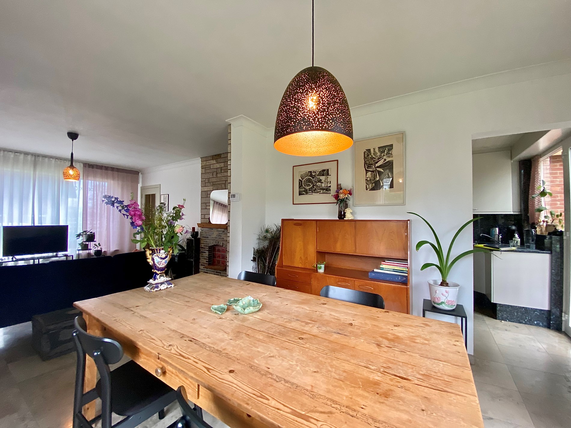 Een ruime inkomhal, ideaal voor het plaatsen van schoenen en opbergen van jassen, een lichtrijke woonkamer met zicht op de grote tuin. Deze geeft toegang tot de ingerichte keuken (fornuis met keramische platen, ijskast en oven). Als extra opbergplaats is er aan de keuken een kelder aanwezig. Via de trap naar boven zijn er 3 slaapkamers en een badkamer (met douche, wastafel en toilet). De woning beschikt ook over een zolder.